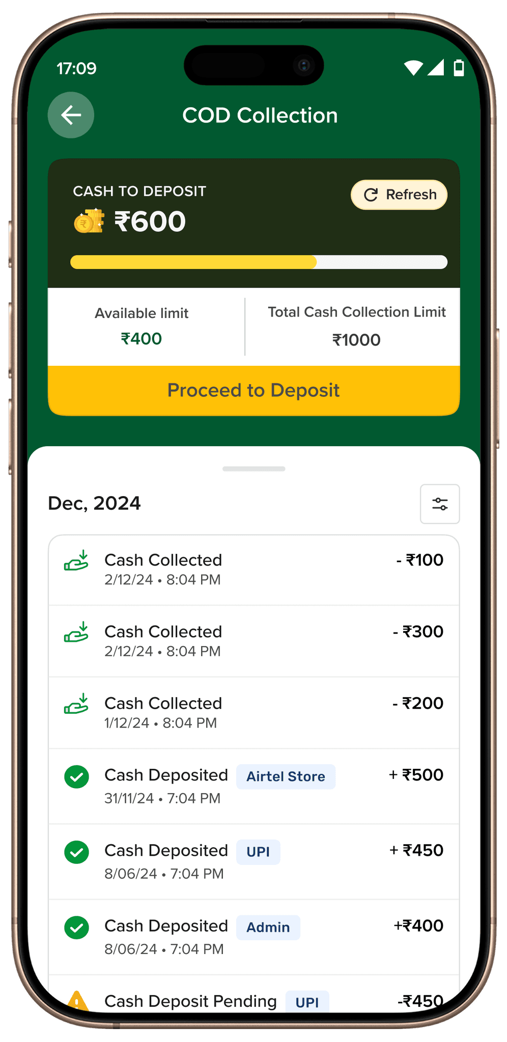 Simplified cash deposit workflows for delivery executives.