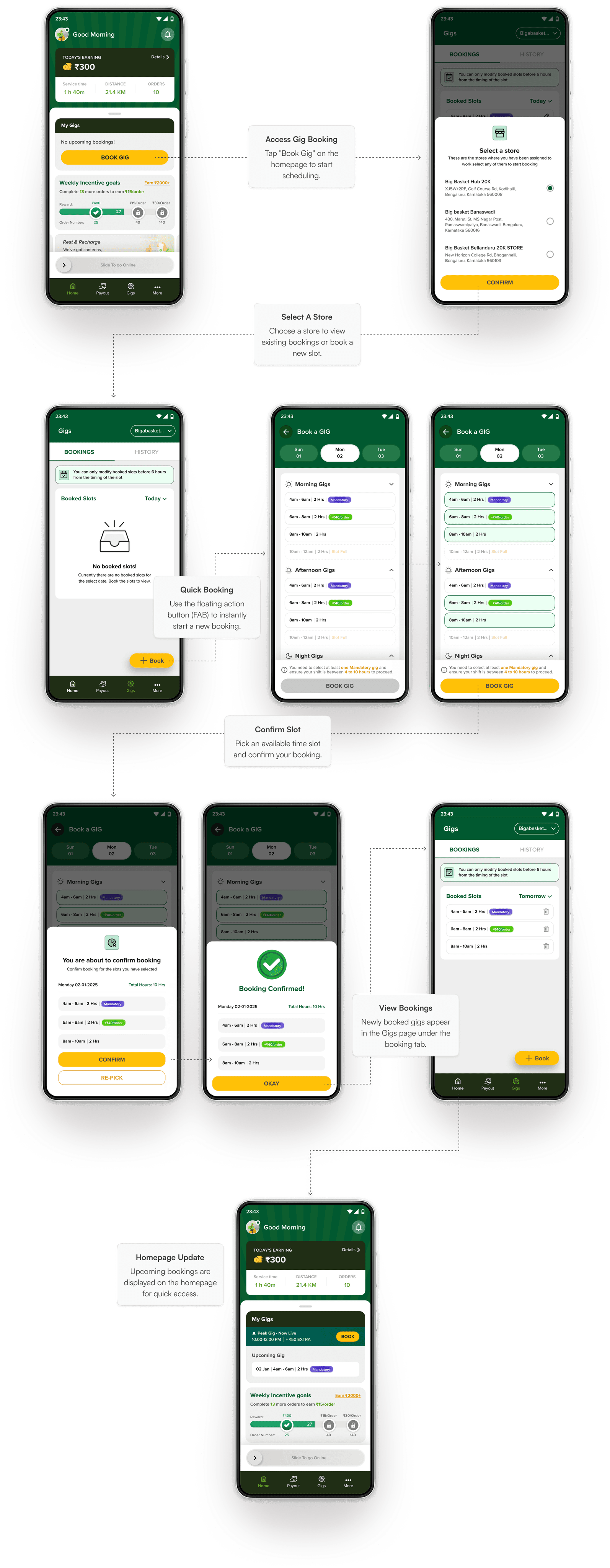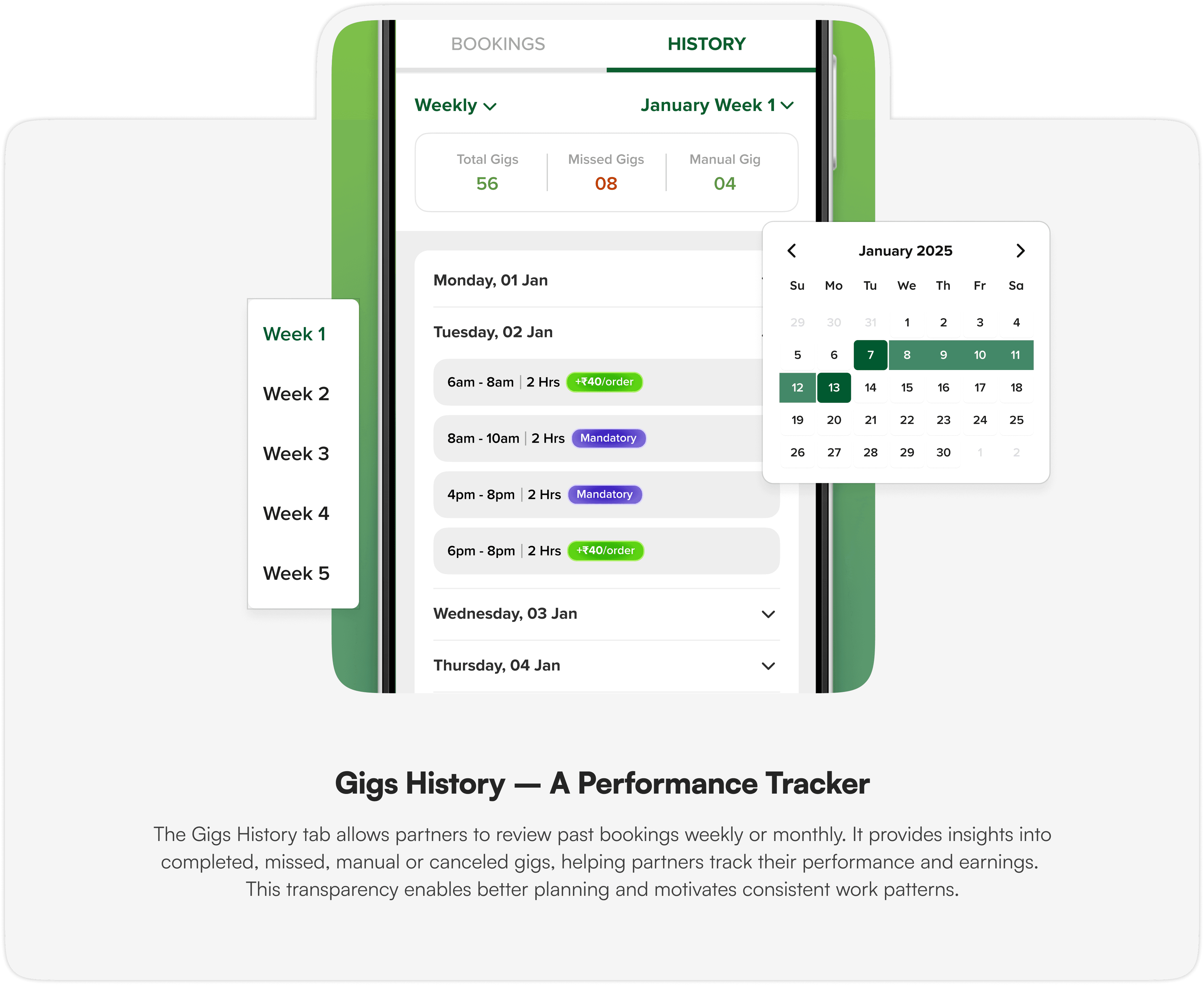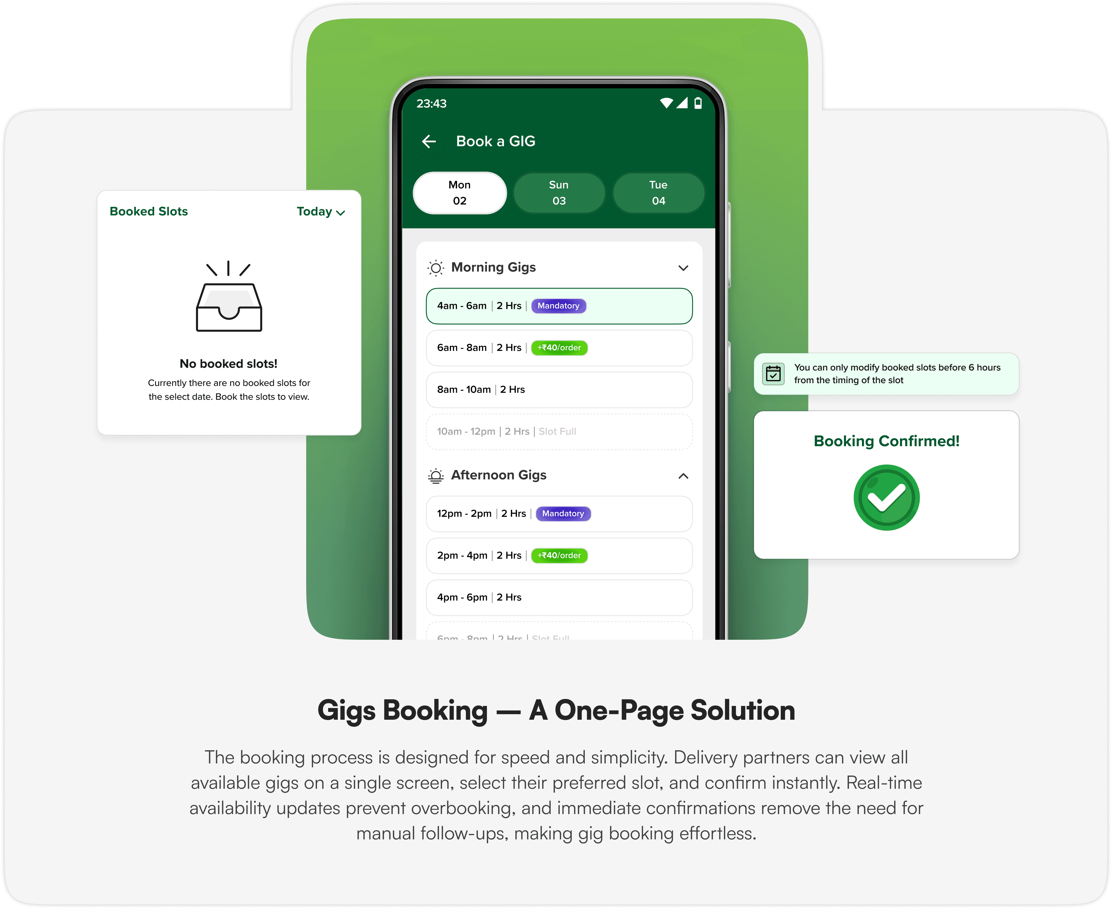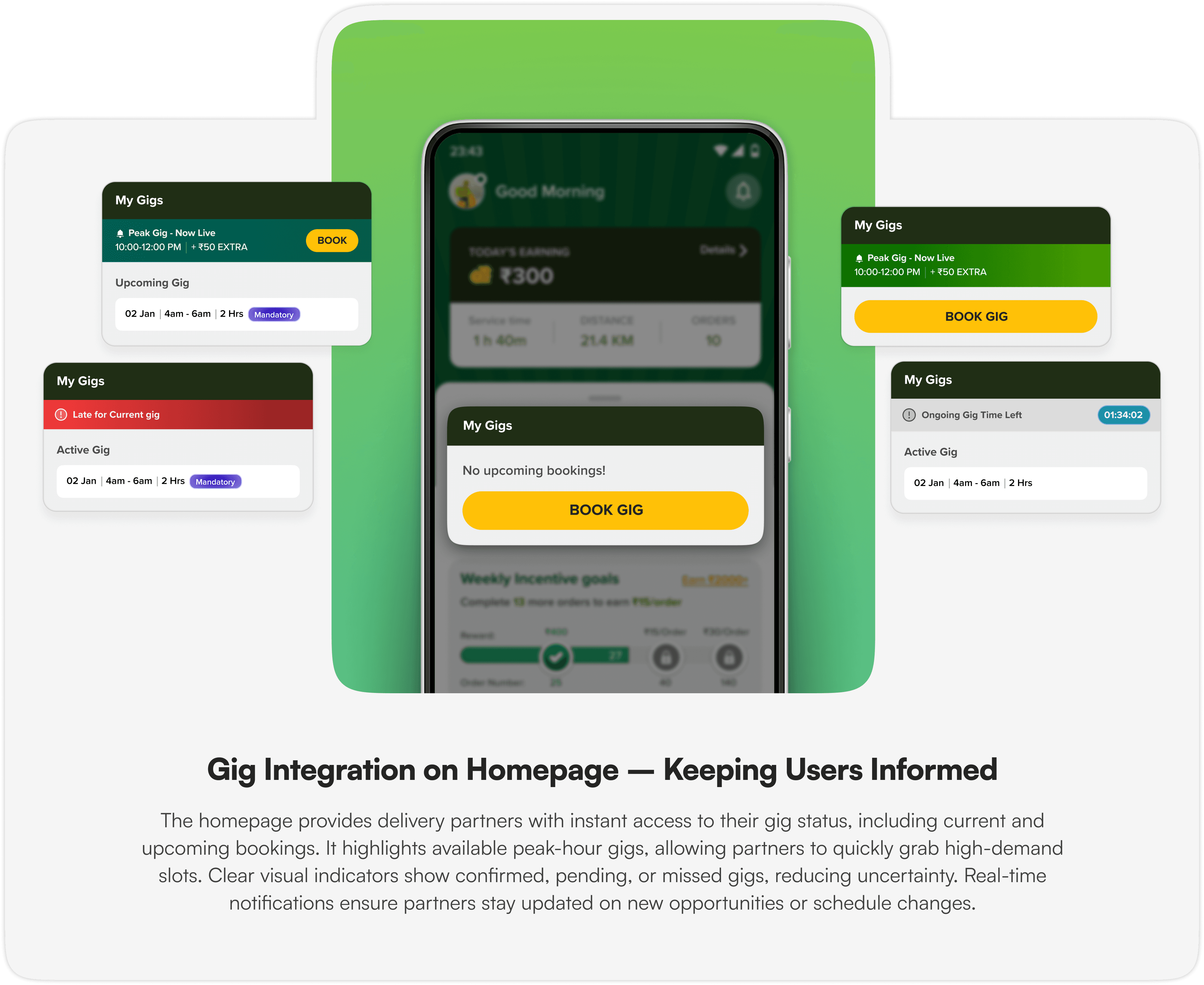 To streamline gig scheduling, the design focuses on accessibility, transparency, and ease of use. Key features ensure delivery partners can quickly check their schedules, book gigs effortlessly, and track their performance without hassle. By integrating these elements into a seamless experience, we empower partners with the tools they need to plan their work efficiently.